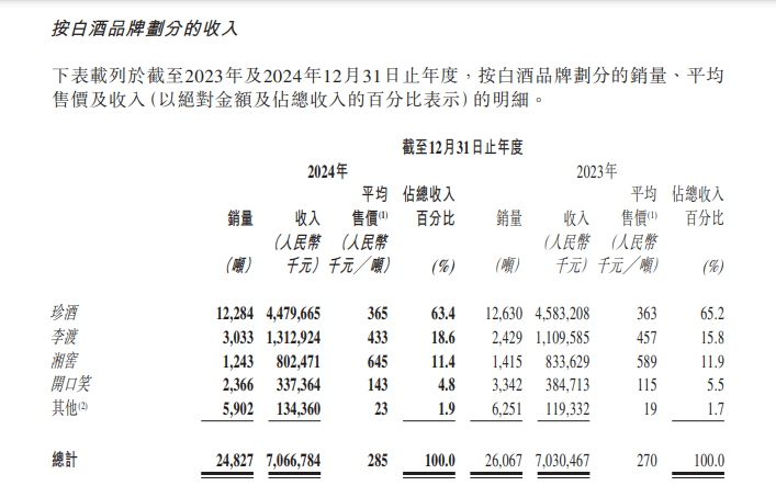 除珍酒外,该公司旗下品牌李渡2024年收入为13.13亿元,收入增加18.3%,占营收比例从2023年的15.8%提升至18.6%;而湘窖、开口笑分别实现收入8.02亿元、3.37亿元,收入均有所下滑,占营收比例分别为11.4%、4.8%。