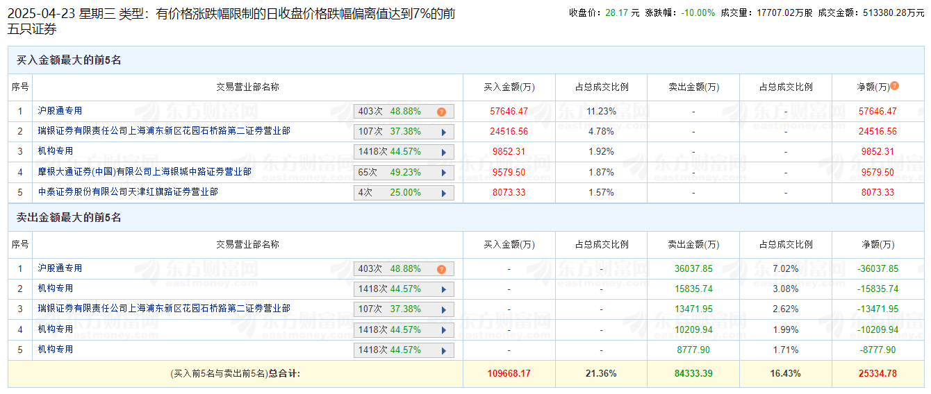 赤峰黄金A股跌停 机构净卖出2.5亿元