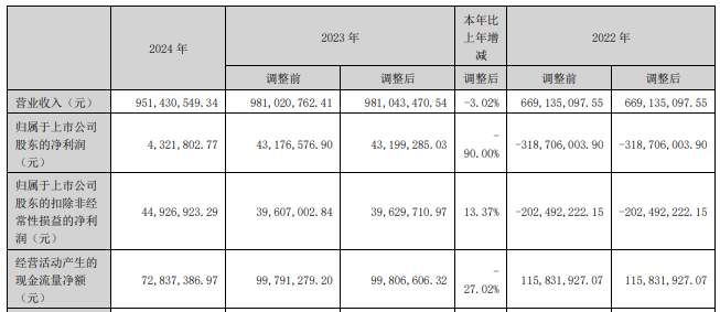 2024年,贝肯能源营业收入为9.51亿元,同比下降3.02%;归属于上市公司股东的净利润432.18万元,同比下降90.00%;归属于上市公司股东的扣除非经常性损益的净利润4492.69万元,同比增长13.37%;经营活动产生的现金流量净额7283.74万元,同比下降27.02%。
