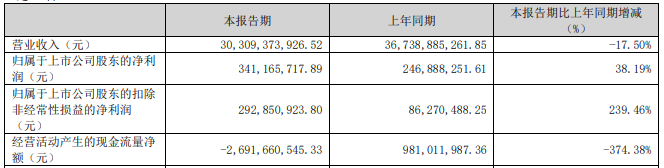 东方盛虹昨晚披露的2025年第一季度报告显示,公司今年首季实现营业收入303.09亿元,同比下降17.50%;归属于上市公司股东的净利润3.41亿元,同比增长38.19%;归属于上市公司股东的扣除非经常性损益的净利润2.93亿元,同比增长239.46%;经营活动产生的现金流量净额-26.92亿元,上年同期为9.81亿元。