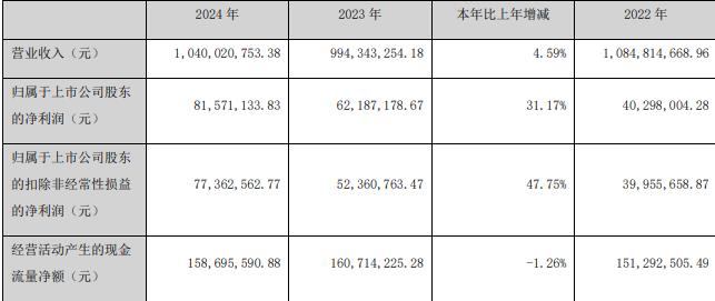据公司2024年年报,2024年,公司实现营业收入10.40亿元,同比增长4.59%;归属于上市公司股东的净利润8157.11万元,同比增长31.17%;归属于母公司所有者的扣除非经常性损益的净利润7736.26万元,同比增长47.75%;经营活动产生的现金流量净额1.59亿元,同比减少1.26%。