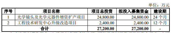 思锐光学原拟募集资金27,200.00万元,分别用于光学镜头及光学元器件增资扩产项目、工程技术研发中心升级改造项目。