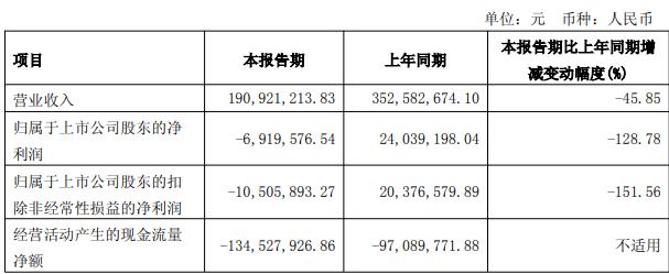 据公司2025年一季报,报告期内,公司实现营业收入1.91亿元,同比减少45.85%;归属于上市公司股东的净利润-691.96万元,同比减少128.78%;扣除非经常性损益后的净利润-1050.59万元,同比减少151.56%;经营活动产生的现金流量净额-1.35亿元。