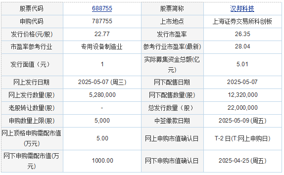 汉邦科技2025年5月6日披露的首次公开发行股票并在科创板上市发行公告显示,按本次发行价格22.77元/股和2,200.00万股的新股发行数量计算,若本次发行成功,预计公司募集资金总额50,094.00万元,扣除发行费用(不含增值税)7,026.65万元后,预计募集资金净额为43,067.35万元。