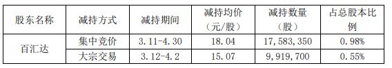 其中,3月11日至4月30日,百汇达通过集中竞价减持17,583,350股,减持均价18.04元/股。3月12日至4月2日,百汇达通过大宗交易减持9,919,700股,减持均价15.07元/股。