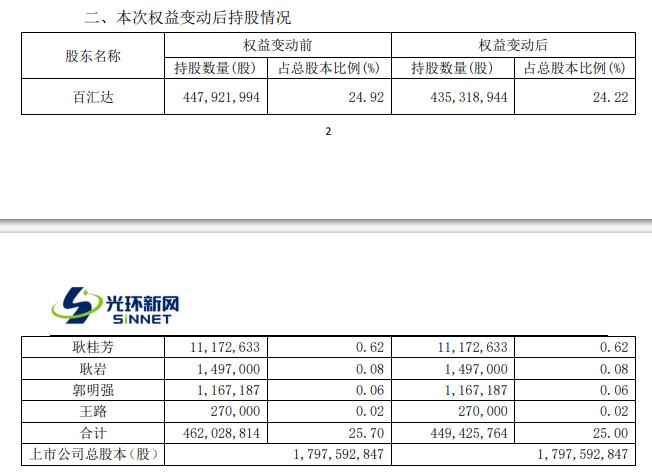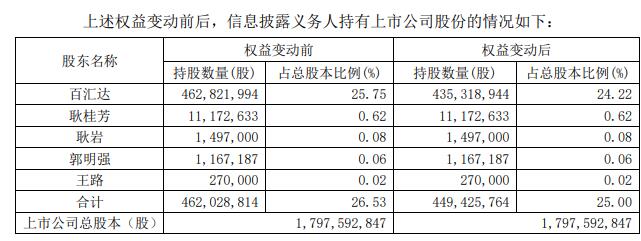 2025年3月11日至2025年4月30日,百汇达通过集中竞价和大宗交易方式累计减持公司股份27,503,050股,导致上述信息披露义务人合计持股比例由26.53%下降至25.00%。