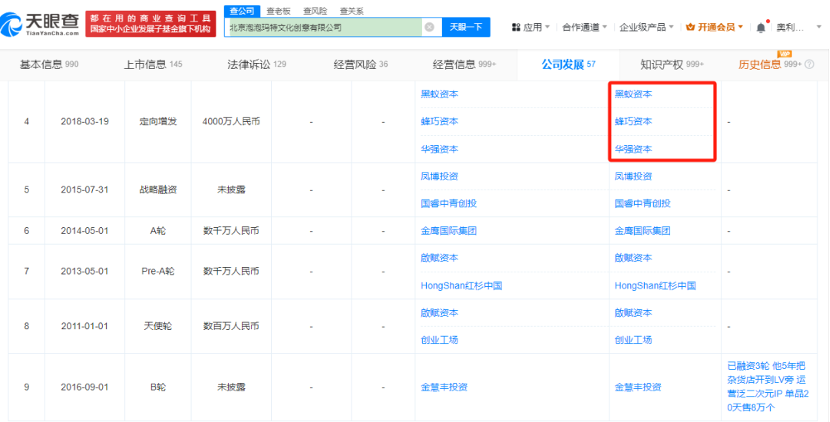 天眼查显示,蜂巧资本在成立后不久,便联合黑蚁资本、华强资本,共同向泡泡玛特投资4000万元。