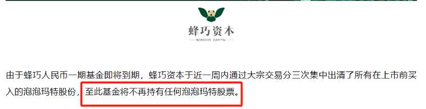 5月7日晚间,蜂巧资本在其微信公众号上发文称,由于蜂巧资本的人民币一期基金即将到期,所以在最近一周以大宗交易方式,分三次出清了持有的泡泡玛特股份。