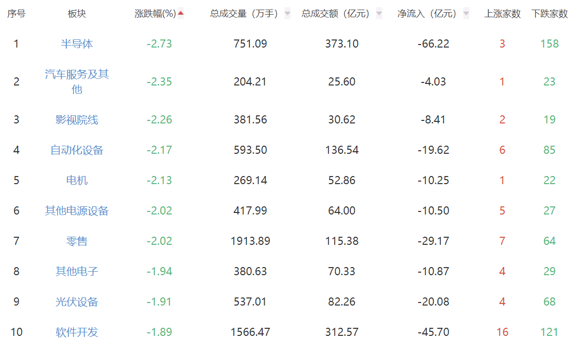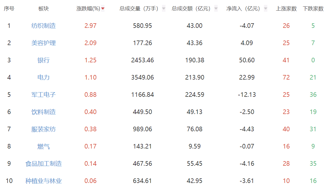 板块方面,纺织制造、美容护理、银行等板块涨幅居前,半导体、汽车服务、影视院线等板块跌幅居前。
