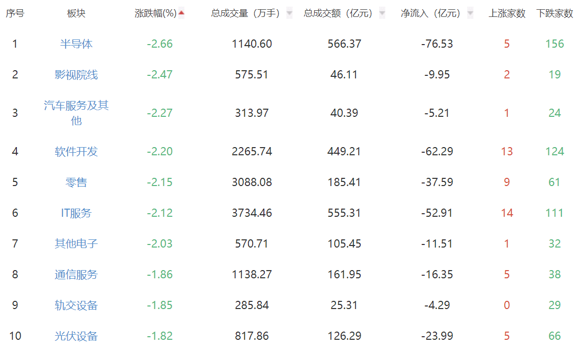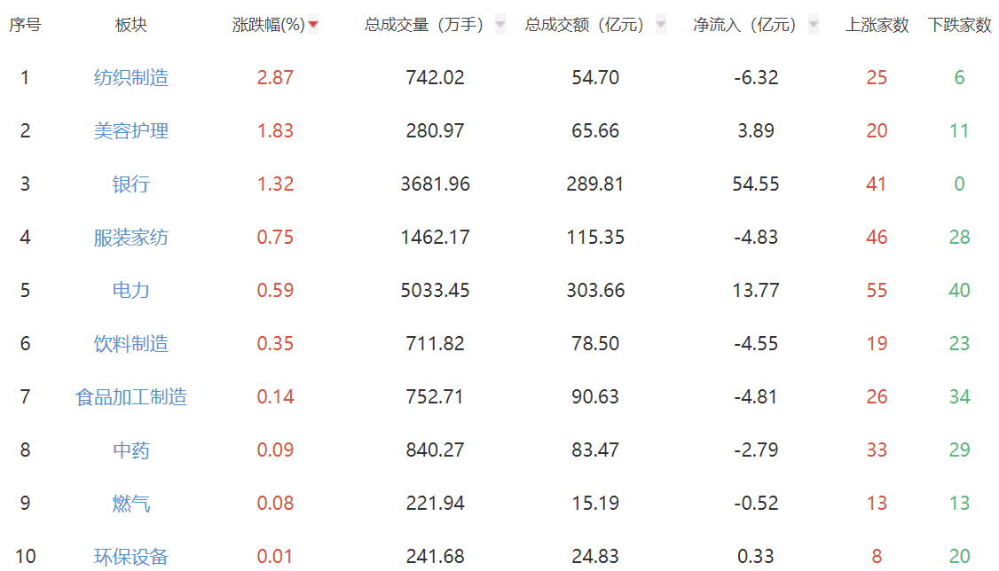 板块方面,纺织制造、美容护理、银行等板块涨幅居前,半导体、影视院线、汽车服务等板块跌幅居前。