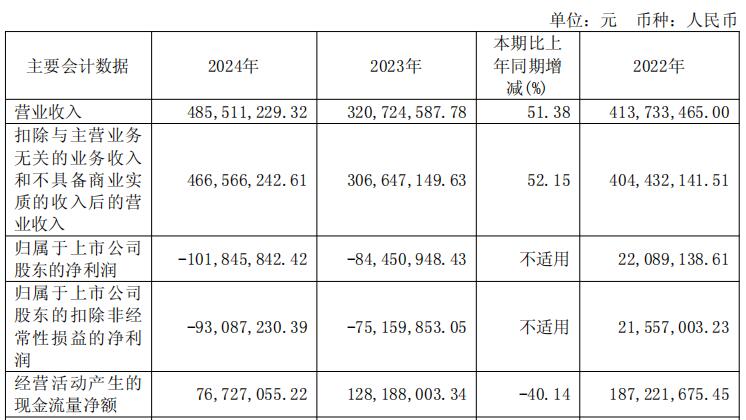 中国经济网北京5月9日讯 美迪凯(688079.SH)近日发布的2024年年度报告显示,2024年,公司实现营业收入4.86亿元,同比增长51.38%;归属于上市公司股东的净利润-1.02亿元,上年同期为-8445.09万元;归属于上市公司股东的扣除非经常性损益的净利润-9308.72万元,上年同期为-7515.99万元;经营活动产生的现金流量净额7672.71万元,同比减少40.14%。