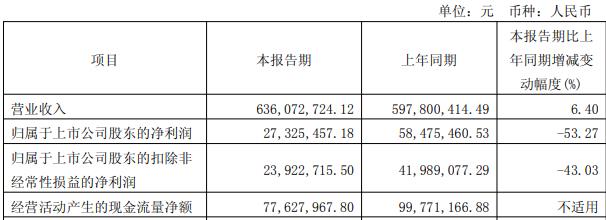 据公司2025年一季报,报告期内,公司实现营业收入6.36亿元,同比增长6.40%;归属于上市公司股东的净利润2732.55万元,同比减少53.27%;归属于母公司所有者的扣除非经常性损益的净利润2392.27万元,同比减少43.03%;经营活动产生的现金流量净额7762.80万元。