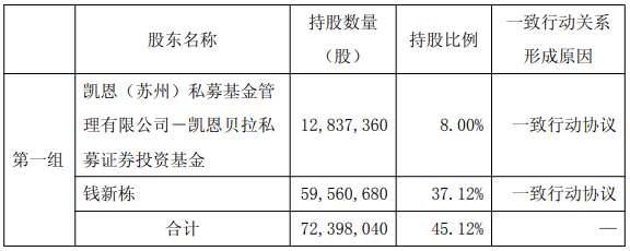 本次减持计划实施前,凯恩贝拉基金持有公司股票12,837,360股,占公司总股本8.00%,上述股份为协议转让取得,均为无限售流通股;公司实控人钱新栋持有公司股票59,560,680股,占公司总股本的37.12%;双方合计持股72,398,040股,持股比例为45.12%。