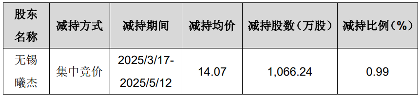 公司于2025年1月15日披露了《关于控股股东一致行动人减持股份的预披露公告》,公司控股股东一致行动人无锡曦杰持有公司股份2,664.6277万股,计划在减持计划预披露公告发布之日起15个交易日后的3个月内(即2025年2月13日至2025年5月12日期间)以大宗交易或集中竞价的方式减持其持有的公司股份不超过1,066.25万股,即不超过公司总股本比例1.00%。