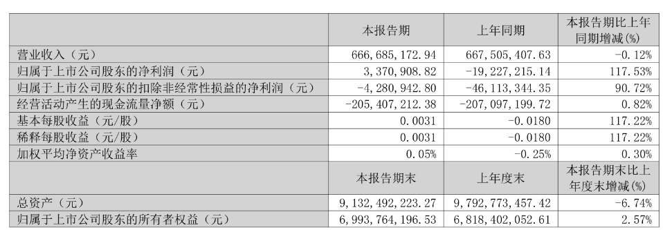 2025年第一季度,公司实现营业收入6.67亿元,同比下降0.12%;归属于上市公司股东的净利润337.09万元,上年同期为-1922.72万元;归属于上市公司股东的扣非净利润为-428.09万元,上年同期为-4611.33万元;经营活动产生的现金流量净额为-2.05亿元,上年同期为-2.07亿元。