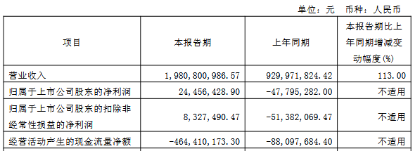 2025年1-3月,公司实现营业收入19.81亿元,同比增长113.00%;归属于上市公司股东的净利润为2,445.64万元,上年同期为-4,779.53万元;归属于上市公司股东的扣除非经常性损益的净利润为832.75万元,上年同期为-5,138.21万元;经营活动产生的现金流量净额为-4.64亿元,上年同期为-8,809.77万元。