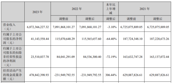 2023年,公司实现营业收入68.72亿元,同比下降3.10%;归属于上市公司股东的净利润4114.36万元,同比下降64.40%;归属于上市公司股东的扣除非经常性损益后的净利润2351.08万元,同比下降72.19%;经营活动产生的现金流量净额4.79亿元,同比增长306.44%。