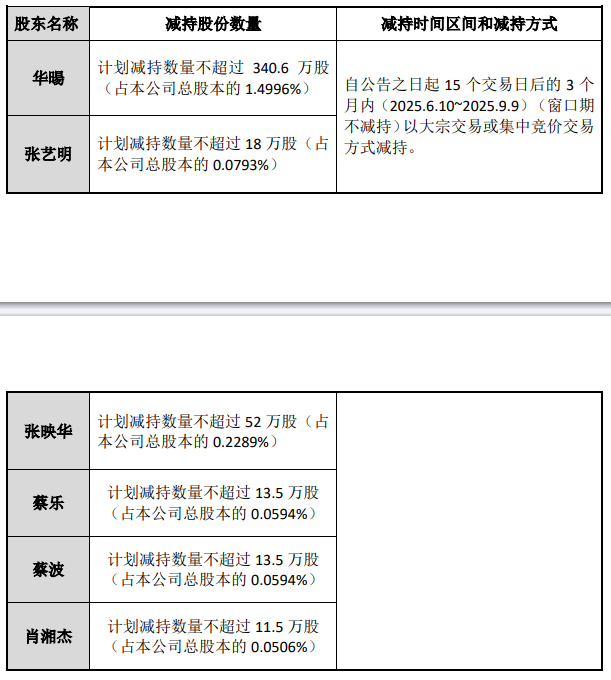 持有公司股份2,309.472万股(占公司总股本的10.1682%)的股东华暘计划自公告之日起15个交易日后的3个月内(2025年6月10日至2025年9月9日)(窗口期不减持)以大宗交易或集中竞价交易方式减持公司股份不超过340.6万股(占公司总股本的1.4996%)。
