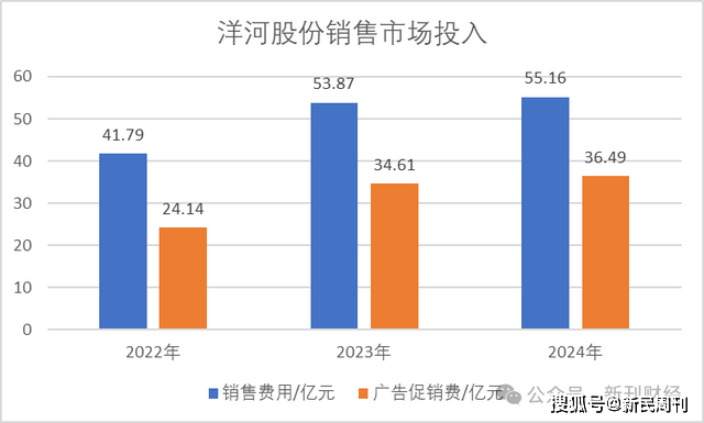 财务数据显示,洋河股份的营销依赖愈发凸显,2022-2024年,公司销售费用持续攀升,从41.79亿元增至55.16亿元,即使在2024年营收下滑的背景下仍保持增长态势。更值得注意的是,占比销售费用超六成的广告促销费用为其销售费用的核心构成,2023年同比激增43.34%,2024年更是维持5.44%的增速。这一数据表明公司对营销驱动的路径依赖日益加深,而在业绩承压期仍选择加大促销力度,反映其产品力不足的困境。