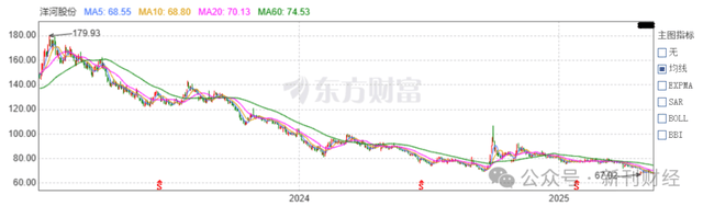 从资本市场表现来看,洋河股份似乎正经历着持续的价值重估。2025年开年以来,公司股价从80.75元持续下行,截至5月20日累计跌幅已达15.67%。若将观察周期拉长,其颓势更为显著,相较2023年初179.93元的高点,当前股价已累计下挫62.15%,远超同期行业平均跌幅。