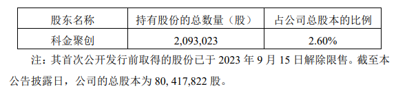 持有公司股份2,093,023股(占公司总股本比例2.60%)的股东科金聚创计划自减持计划公告之日起15个交易日后的3个月内通过集中竞价交易方式减持公司股份不超过804,178股(即不超过公司总股本的1.00%)或自减持计划公告之日起3个交易日后的3个月内通过大宗交易方式减持公司股份不超过1,608,356股(即不超过公司总股本的2.00%),合计减持不超过2,093,023股,占公司总股本的2.60%。