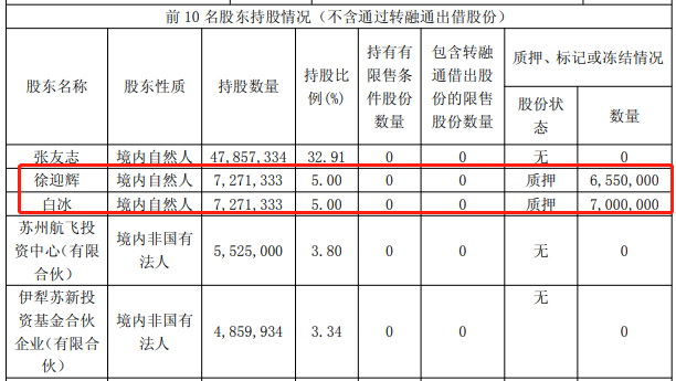 迈信林2025年4月30日披露的关于持股5%以上股东部分股份质押的公告显示,本次质押后,公司股东白冰累计质押公司股份7,000,000股,占其持股总数的96.27%,占公司总股本的4.81%;公司股东徐迎辉累计质押公司股份6,550,000股,占其持股总数的90.08%,占公司总股本的4.50%。二人质押股份合计占公司总股本的9.31%。