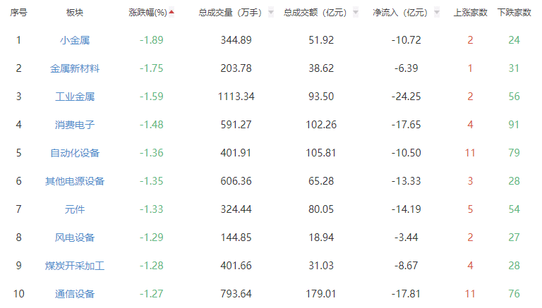 板块方面,饮料制造、互联网电商、化学纤维等板块涨幅居前,小金属、金属新材料、工业金属等板块跌幅居前。