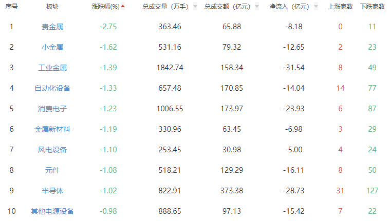 板块方面,农化制品、饮料制造、化学纤维等板块涨幅居前,贵金属、小金属、工业金属等板块跌幅居前。