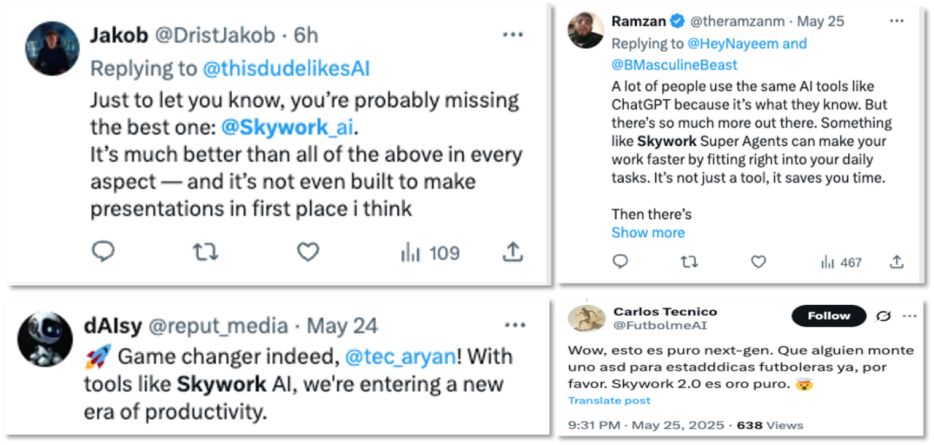 作为采用了AI agent架构和deep research技术,能够一站式生成文档、PPT、表格(excel)、网页、播客和音视频多模态内容的新一代智能体,一经正式发布后,昆仑万维天工超级智能体相关话题在微博平台总阅读量超过3.5亿,在X、Google、Linkedin、Youtube等平台上两天内阅读量超过2000万次。