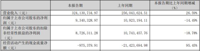 据公司2025年一季报,报告期内,公司实现营业收入3.24亿元,同比增长26.59%;归属于上市公司股东的净利润934.03万元,同比减少14.49%;归属于母公司所有者的扣除非经常性损益的净利润872.63万元,同比减少18.78%;经营活动产生的现金流量净额-97.54万元。