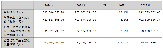 2024年,公司实现营业收入3.33亿元,同比增长28.15%;归属于上市公司股东的净利润为-2,264.75万元,上年同期为-2,387.49万元;归属于上市公司股东的扣除非经常性损益的净利润为-3,187.93万元,上年同期为-3,279.40万元;经营活动产生的现金流量净额为4,270.86万元,同比增长112.01%。