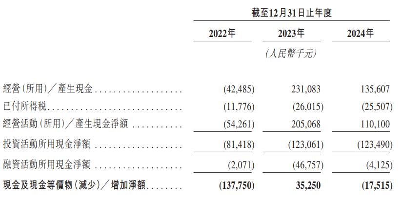 2022年、2023年、2024年,手回集团经营活动所用现金净额5426.1万元、经营活动产生现金净额2.05亿元、经营活动产生现金净额1.10亿元。