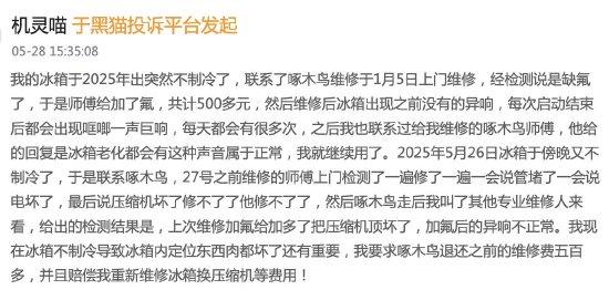 啄木鸟维修五个月后冰箱报废,消费者维权遭呛:“使了5个月找我们,可笑!”