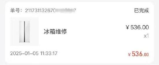2025年1月初,王女士家中冰箱突然罢工停止制冷。她随即联系知名家电维修平台“啄木鸟家电维修”。1月5日,啄木鸟维修师傅上门检测后,给出明确结论:冰箱缺氟利昂,并当场进行了加氟操作。此次维修,王女士支付了500多元费用。