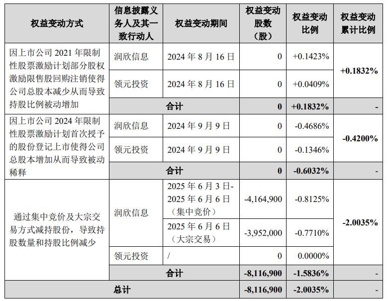 润欣科技表示,本次权益变动前,润欣信息及其一致行动人领元投资合计持有公司136,260,750股,占公司当时总股本(504,603,447股)的27.0035%。本次权益变动后,润欣信息及其一致行动人合计持有公司128,143,850股,占公司目前总股本(512,575,047股)的25.0000%。