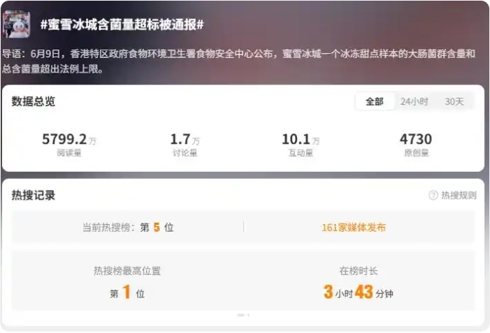 6月11日,话题#蜜雪冰城含菌量超标被通报#引发关注,一度登上微博热榜第一。