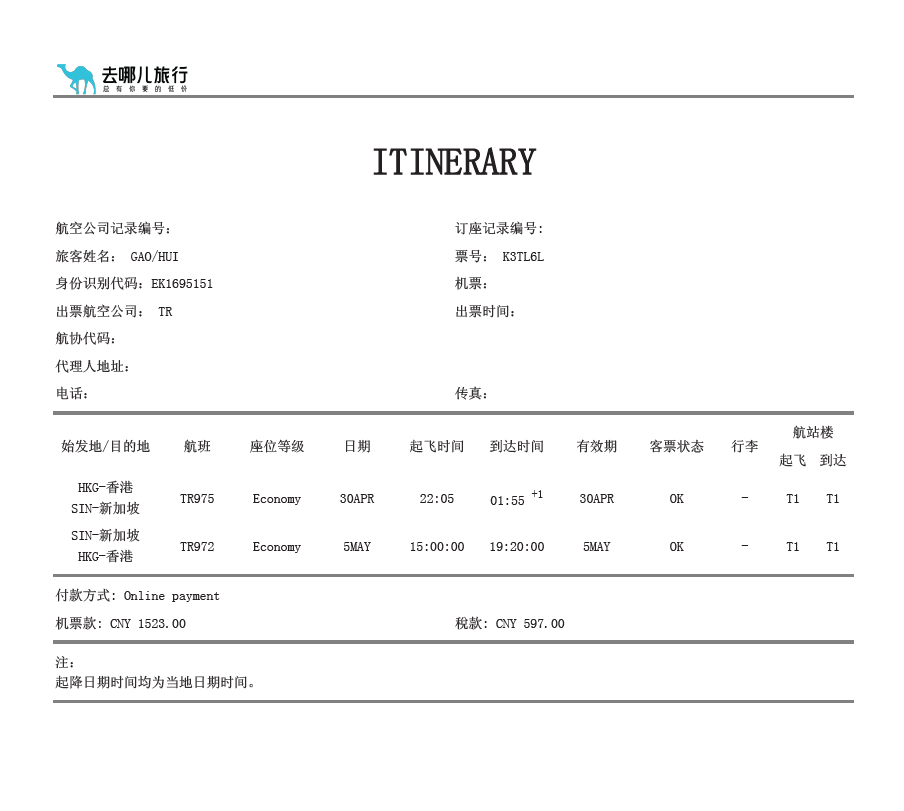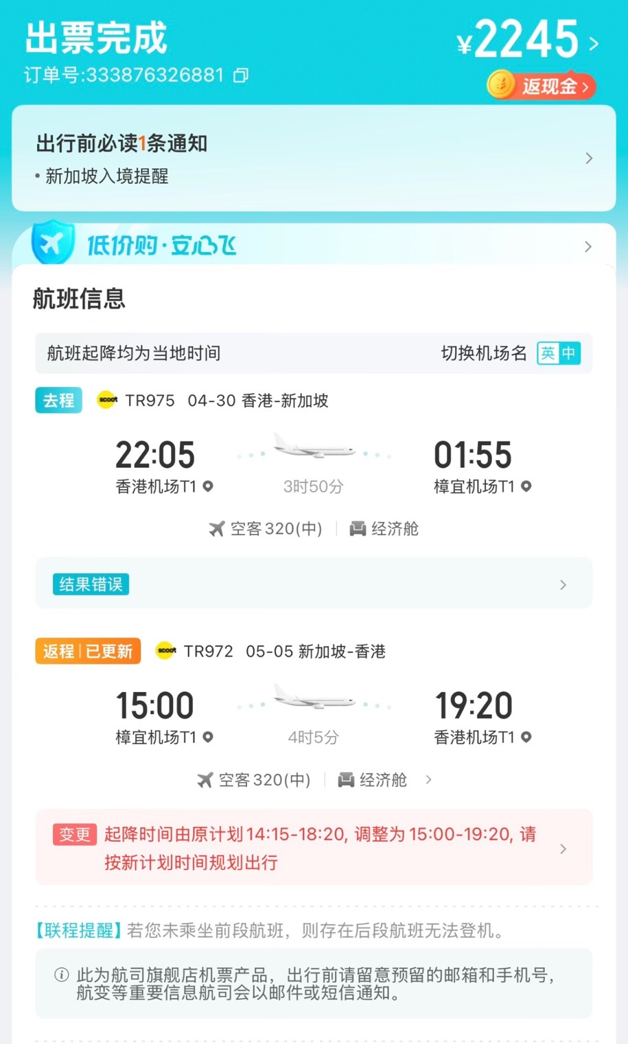 高女士提供的订票信息显示,她于2024年10月在去哪儿平台购买了酷航从香港到新加坡的往返机票,去程为2025年4月30日22时05分,返程为2025年5月5日14时15分,票价共计2245元。在出发前,去程及返程航班均发生变更,然而高女士仅收到去哪儿平台对返程航变的提醒。