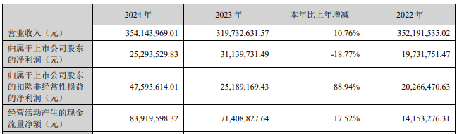2024年,台基股份营业收入为3.54亿元,同比增长10.76%;归属于上市公司股东的净利润0.25亿元,同比下降18.77%;归属于上市公司股东的扣除非经常性损益的净利润为0.48亿元,同比增长88.94%;经营活动产生的现金流量净额0.84亿元,同比增长17.52%。