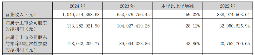 2021年至2024年,倍杰特营业收入分别为7.13亿元、8.39亿元、6.53亿元、10.41亿元;归母净利润分别为1.74亿元、3295.06万元、1.04亿元、1.33亿元。