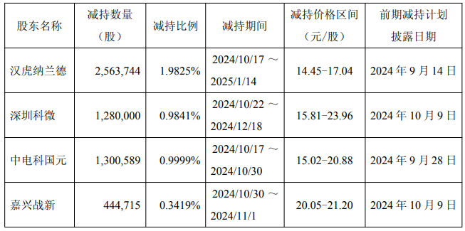 因股东资金需求,公司股东汉虎纳兰德、高灵投资、深圳科微、清科和清一号、中电科国元及嘉兴战新拟通过集中竞价交易、大宗交易或两种方式相结合的方式减持所持公司股份,减持股份数量合计不超过7,321,602股,占公司总股本比例不超过5.66%。其中,单个股东及其一致行动人若通过集中竞价交易方式减持股份的,连续90个自然日内,减持股份的总数不超过公司股份总数的1%,若通过大宗交易方式减持股份的,连续90个自然日内,减持股份的总数不超过公司股份总数的2%。