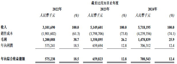 2022年、2023年、2024年,周六福收入分别为人民币3,101.7百万元、人民币5,149.6百万元、5,718.2百万元,年内利润分别为人民币575.2百万元、人民币659.7百万元、人民币706.3百万元。