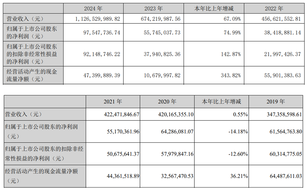2021年至2024年,强瑞技术的营业收入分别为4.22亿元、4.57亿元、6.74亿元和11.27亿元;归属于上市公司股东的净利润分别为5517.04万元、3841.89万元、5574.50万元和9754.77万元;归属于上市公司股东的扣非净利润分别为5067.56万元、2199.74万元、3794.08万元和9214.87万元;经营活动产生的现金流量净额分别为4436.15万元、5590.14万元、1068.00万元和4739.99万元。