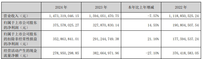 2024年年度报告显示,2024年,公司营业收入14.73亿元,同比减少7.57%;归属于上市公司股东的净利润3.76亿元,同比增长14.55%;归属于上市公司股东的扣除非经常性损益的净利润3.53亿元,同比增长21.16%;经营活动产生的现金流量净额2.79亿元,同比减少27.10%。
