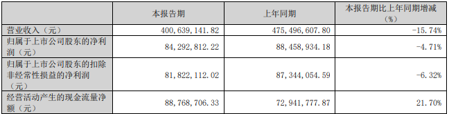 2025年一季度报告显示,2025年第一季度,公司营业收入4.01亿元,同比减少15.74%;归属于上市公司股东的净利润8429.28万元,同比减少4.71%;归属于上市公司股东的扣除非经常性损益的净利润8182.21万元,同比减少6.32%;经营活动产生的现金流量净额8876.87万元,同比增长21.70%。