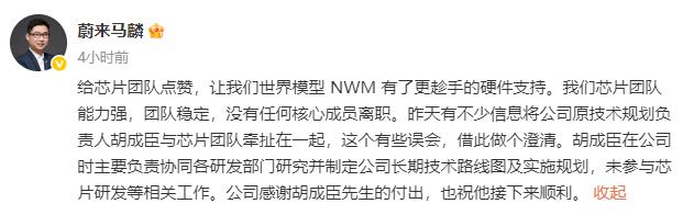 蔚来技术规划首席专家胡成臣离职,高管回应:其未参与芯片研发相关工作