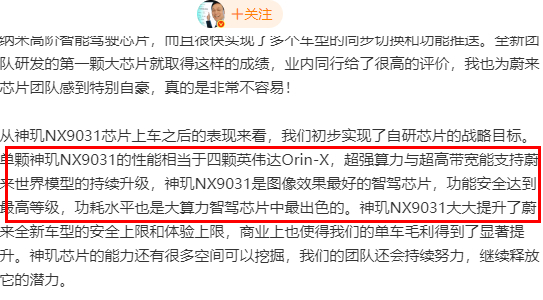 自研芯片效能如何?李斌用多个“最”字进行评价:单颗神玑NX9031的性能相当于四颗英伟达Orin-X,神玑NX9031是图像效果最好的智驾芯片,功能安全达到最高等级,功耗水平也是大算力智驾芯片中最出色的。