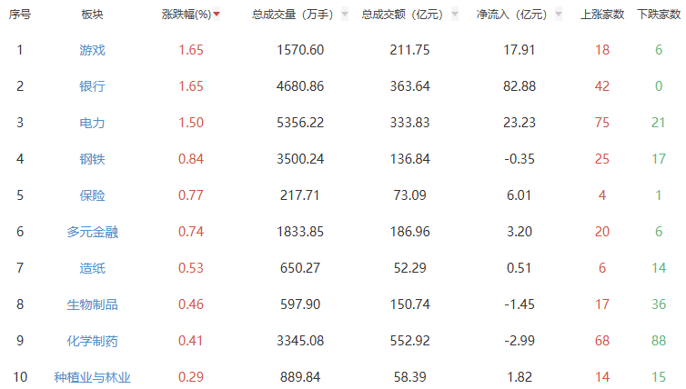 板块方面,游戏、银行、电力等板块涨幅居前,能源金属、电池、风电设备等板块跌幅居前。