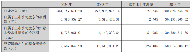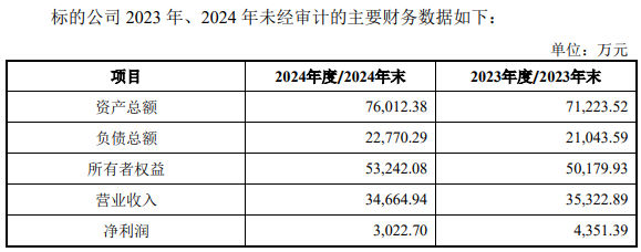 标的公司去年业绩下降。标的公司2023年、2024年营业收入分别为35,322.89万元、34,664.94万元,净利润分别为4,351.39万元、3,022.70万元。