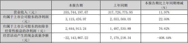 据公司2025年一季报,报告期内,公司实现营业收入3.56亿元,同比增长11.97%;归属于上市公司股东的净利润311.55万元,同比增长22.00%;扣除非经常性损益后的净利润264.49万元,同比增长76.62%;经营活动产生的现金流量净额-2214.39万元,同比减少408.44%。