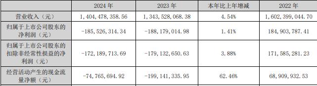 据公司2024年年报,报告期内,公司实现营业收入14.04亿元,同比增长4.54%;归属于上市公司股东的净利润-1.86亿元,2023年为-1.88亿元;扣除非经常性损益后的净利润-1.72亿元,2023年为-1.79亿元;经营活动产生的现金流量净额-7476.57万元。